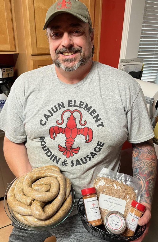 Now, Wes is co-owner of Cajun Element, with his fiancé Robyn Shepherd, making delicious pork, shrimp, and crawfish boudin along with other delicious specialty foods. Talking about the difference between his and other boudins, he says, “Mine has more meat than rice and I don’t grind the meat; I mix it with a mixer.”